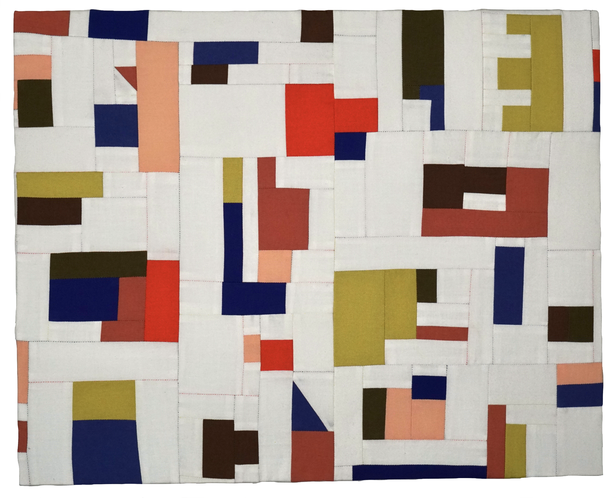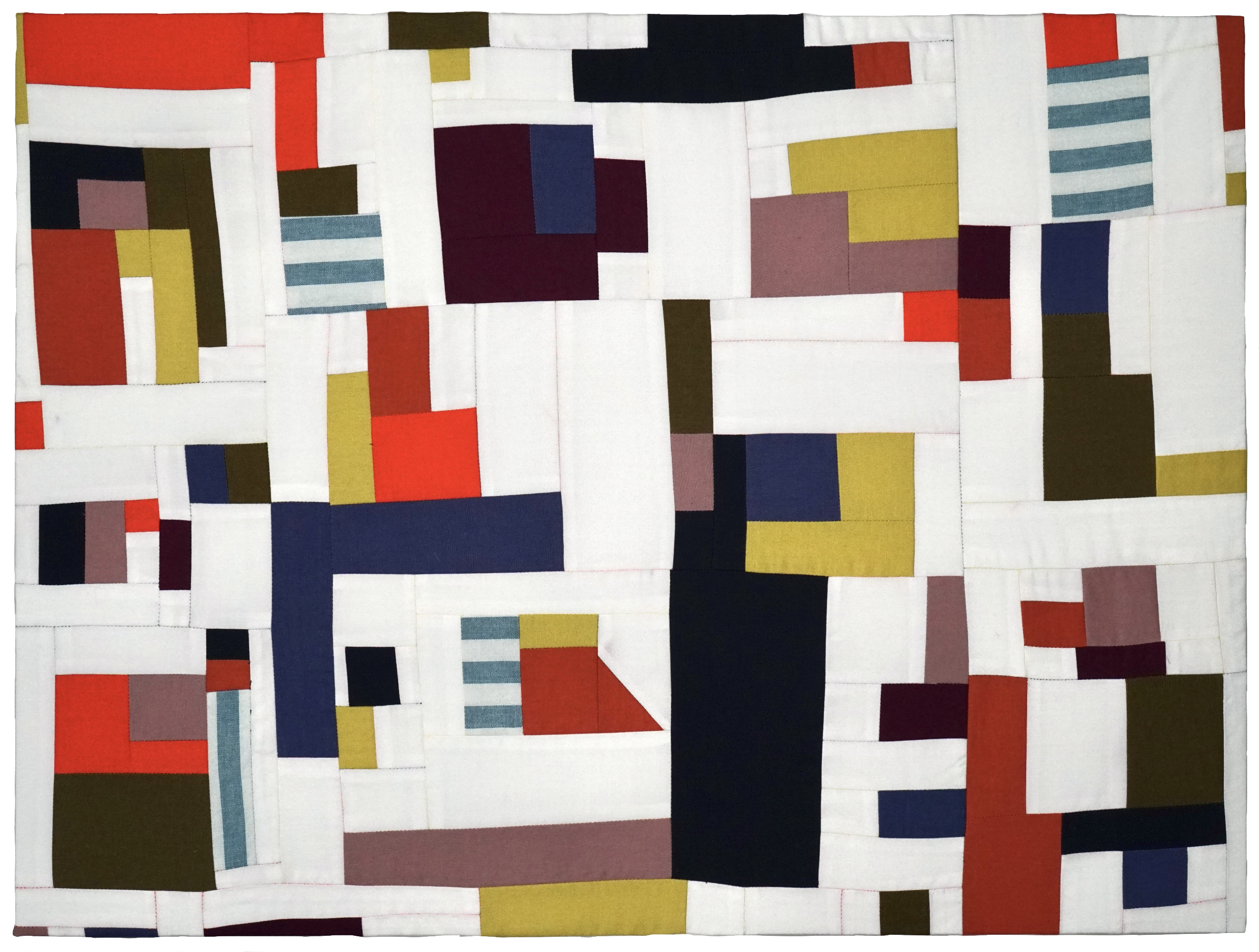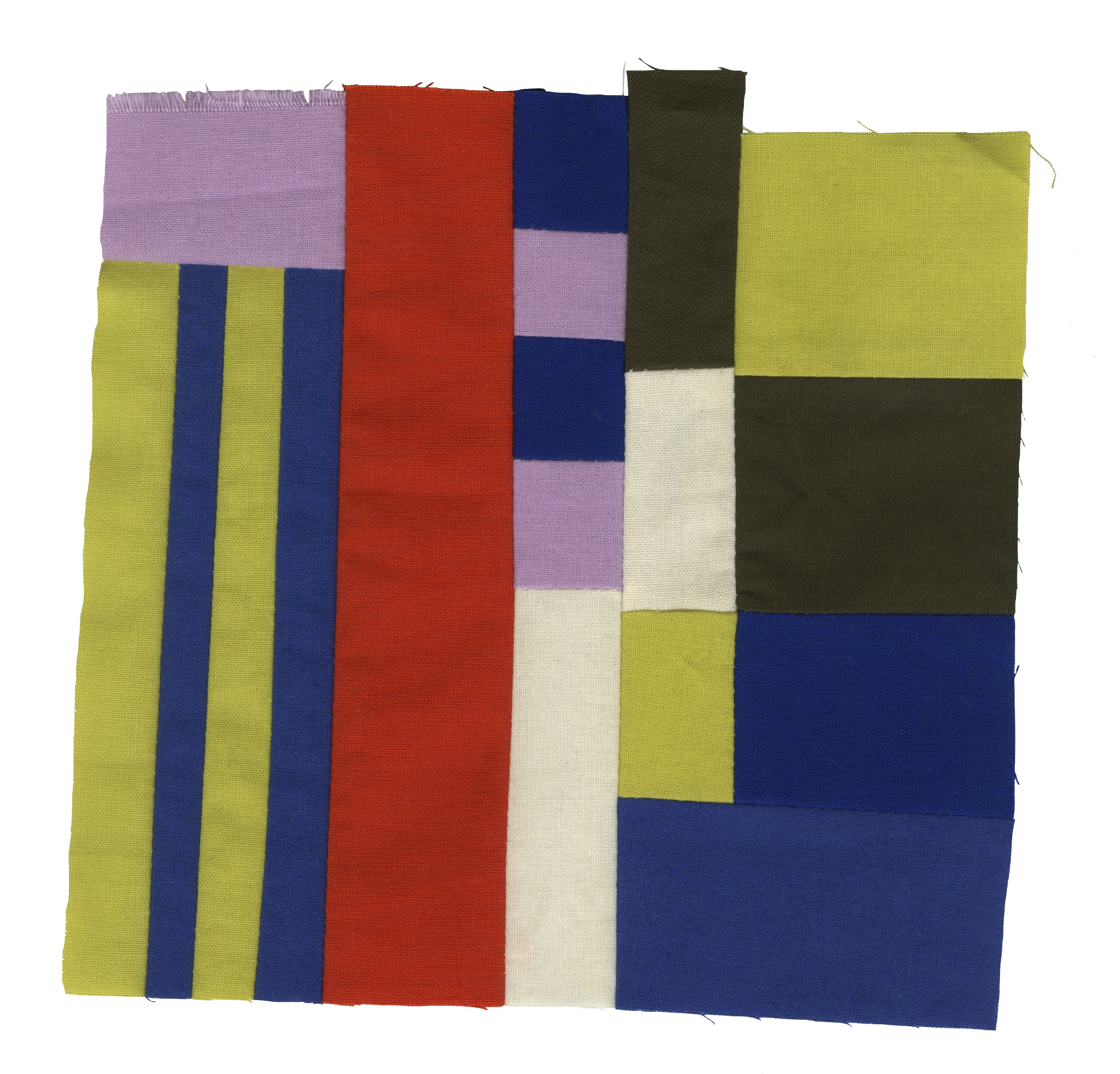 My scrap studies are exercises in improvisational quilting, through which I work instinctively to arrange compositions of color and shape. I aim to make something special from nothing: I do not use sewing patterns and all the fabrics I use are secondhand. Though my process is intuitive, I actively borrow and am inspired by the shapes and symbols of architectural plans, elevations, and urban spaces. These studies are my way of exploring whether impromptu arrangements of colored fabric scraps can lead to something more.